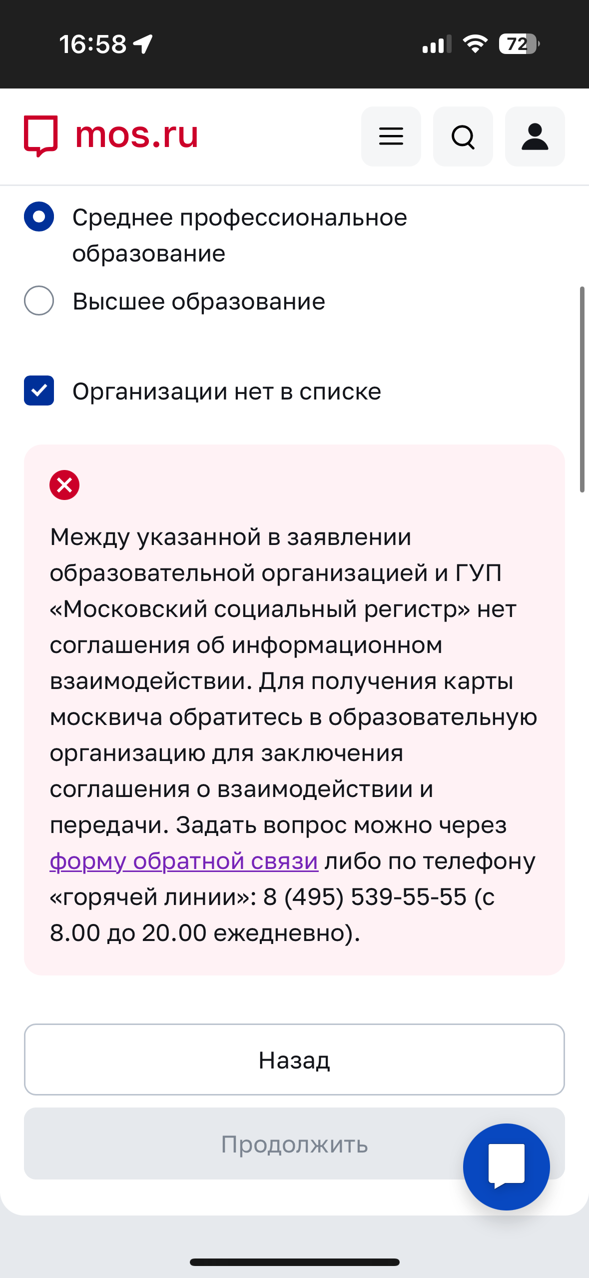 Благодарим за обращение! Для оформления карты москвича Вам необходимо обратиться в студенческий отдел кадров по номеру телефона 8 (499) 164-94-46